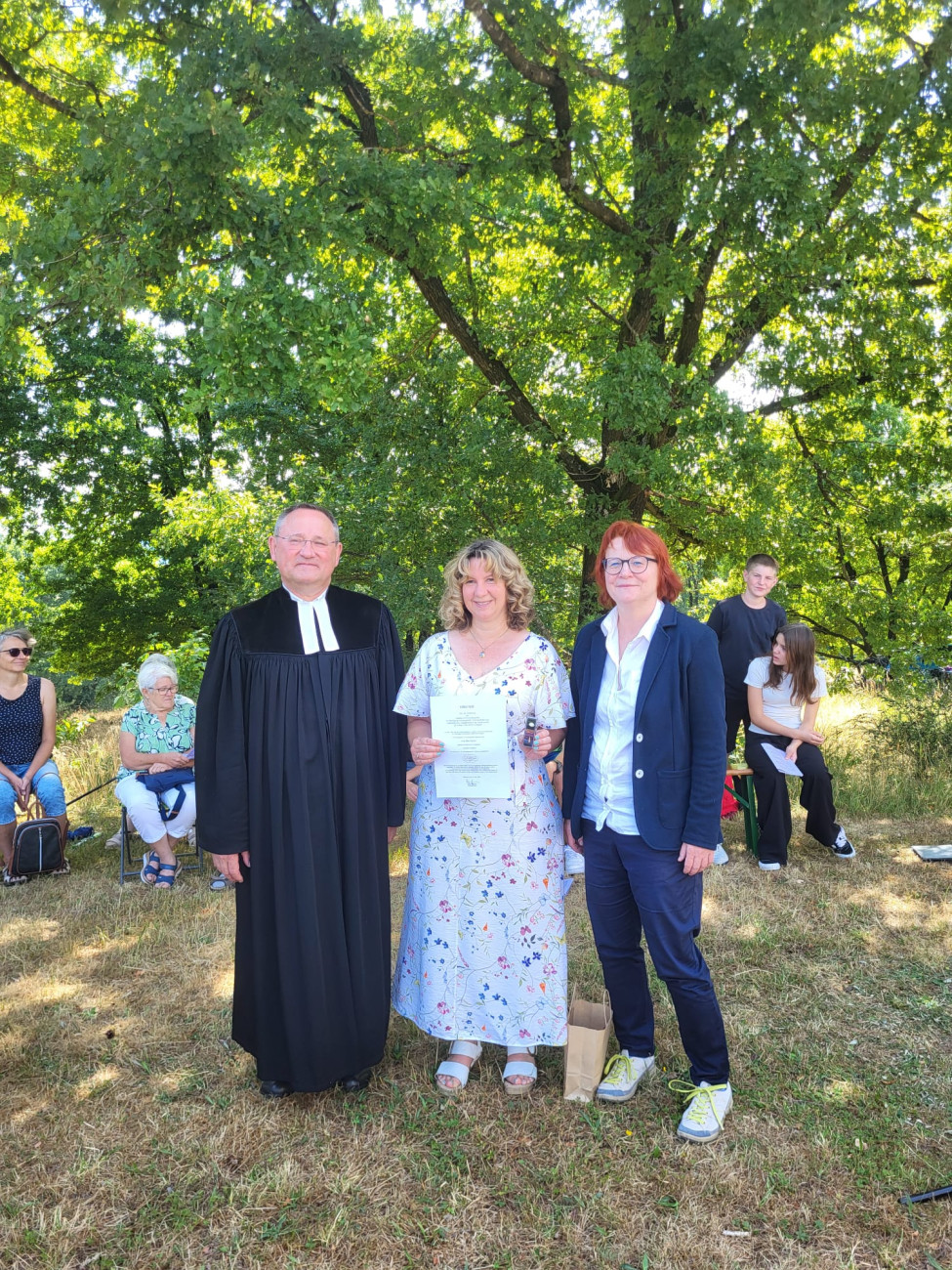 Diese Wertschätzung soll mit der Verleihung der SoliDeoGloria-Nadel geschehen. Der Titel begründet sich u.a. bei J.S. Bach und G. F. Händel. Sie versahen ihre kirchenmusikalischen Werke mit dem Signum „SDG“ („Soli Deo Gloria“). Mit diesem Zeichen haben Sie eine wesentliche Ausrichtung aller Kirchenmusik zeitlos vorgegeben. Die Ehrung ist auch mit einem kleinen finanziellen Zuschuss in Höhe von 1.000 EUR für die örtliche Kirchenmusik (etwa zum Notenerwerb, Chorwochenende, o.ä.) verbunden. Dekanin Murner und Pfarrer Dr. Liebenberg gratulierten Elke Fischer im Namen der Kirchengemeinde und des Dekanats herzlich zu dieser Auszeichnung.